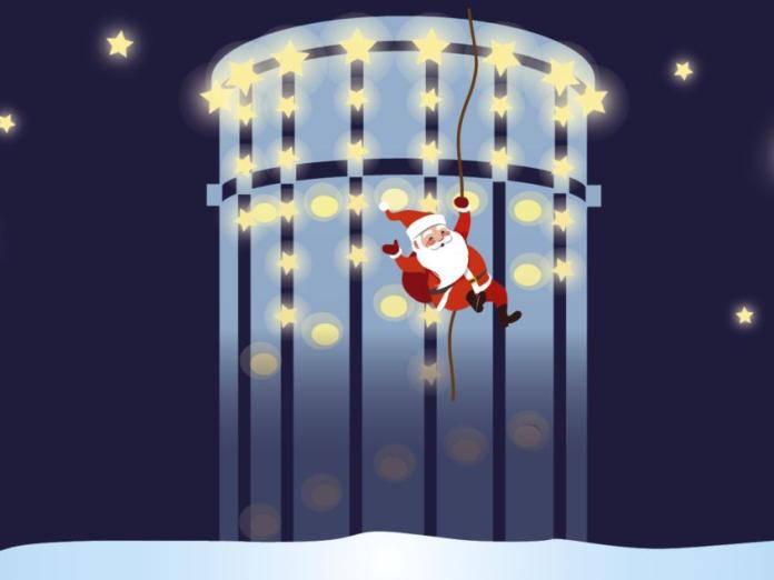 Julemanden rappeller ned ad vandtårnet og lyset på Vandtårnet tændes.